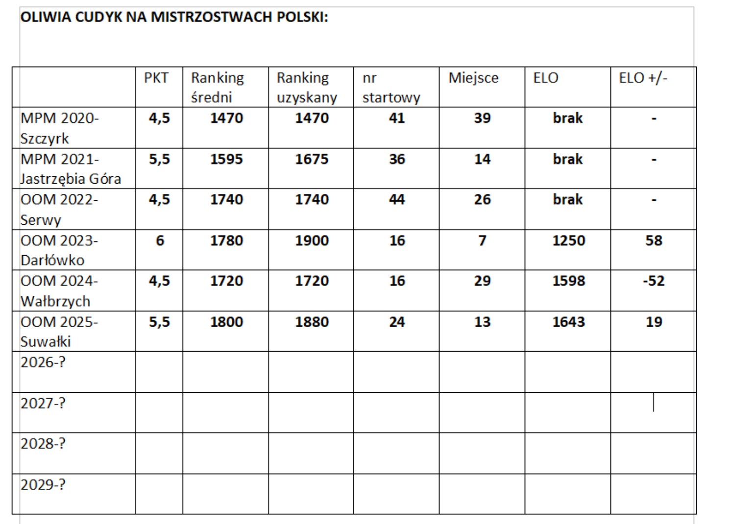 Oliwia Cudyk zdobywając 5,5pkt w dziewięciu partiach zajęła 13 miejsce w gronie 52 finalistek (awans na Mistrzostwa Europy Juniorek w szachach klasycznych). Był to drugi najlepszy rezultat Oliwki w historii występów na Mistrzostwach Polski. Oliwia dorzuciła 19 oczek do swojego rankingu.