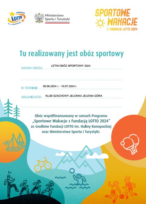 LETNI OBÓZ SPORTOWY 2024 DOFINANSOWANY BYŁ ZE ŚRODKÓW MINISTERSTWA SPORTU I TURYSTKI ORAZ FUNDACJI LOTTO im.H.KONOPACKIEJ W PROGRAMIE SPORTOWE WAKACJE 2024