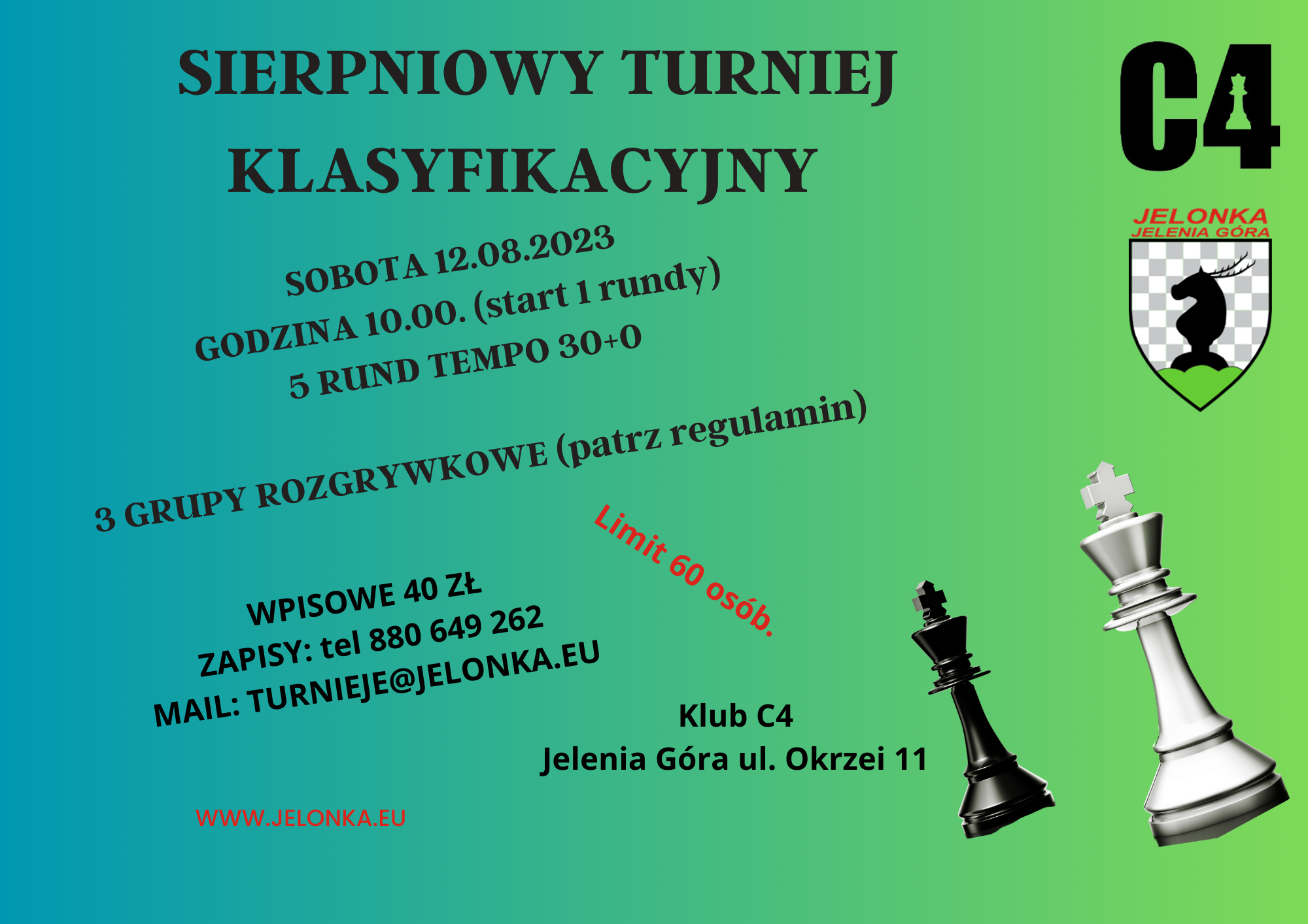 Najbliższa okazja, aby zagrać turniej w Jeleniej Górze to Sierpniowy Turniej Klasyfikacyjny, na którym można zrobić normą na V i IV kategorię.